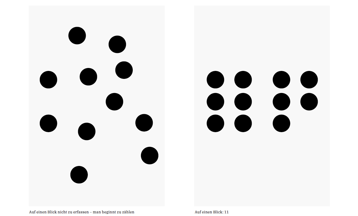 Gestalten heißt immer zuerst einmal ordnen. Was ist wichtig ? Was ist weniger wichtig ? Was ist unwichtig ? Was gehört zusammen ? Was muss getrennt werden ? Was kann in welche Hierarchie gebracht werden ? Ziel dieser Ordnung: Sie soll vom Leser nicht bewusst wahrgenommen werden, weil sich die Aufnahme von Informationen für den Betrachter ganz selbstverständlich anfühlen muss. Frei nach Dieter Rams: „Gutes Design ist so wenig Design wie möglich“. Das Beispiel zeigt, wie durch Hierarchie und Gruppierung das Zählen der unterschiedlichen Elemente und das Erkennen von zwei gleichen Elementen viel einfacher und schneller wird ¶