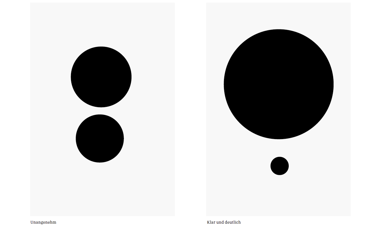 Objekte, die sich in Größe oder Farbe sehr ähnlich, aber nicht genau gleich sind, wirken langweilig, störend und unentschlossen. Deshalb empfiehlt sich folgender Kunstgriff, frei nach einem berühmten süddeutschen Art-Director: „Wenn de ned weider kommsch, machschs entweder ganz kloi oder ganz groß. Auf hochdeutsch: Ein Layout wirkt besser, wenn Objekte entweder ganz klein oder ganz groß gezeigt werden ¶